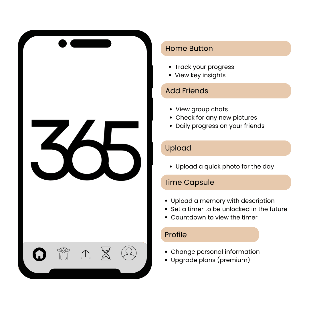 Our design process started by identifying what users need most, including viewing content on Home, connecting with others through Add Friends, sharing posts using Upload, saving important moments in the Time Capsule, and managing their account through Profile. We focused on keeping only these essential features to avoid clutter and make the app easy to understand.